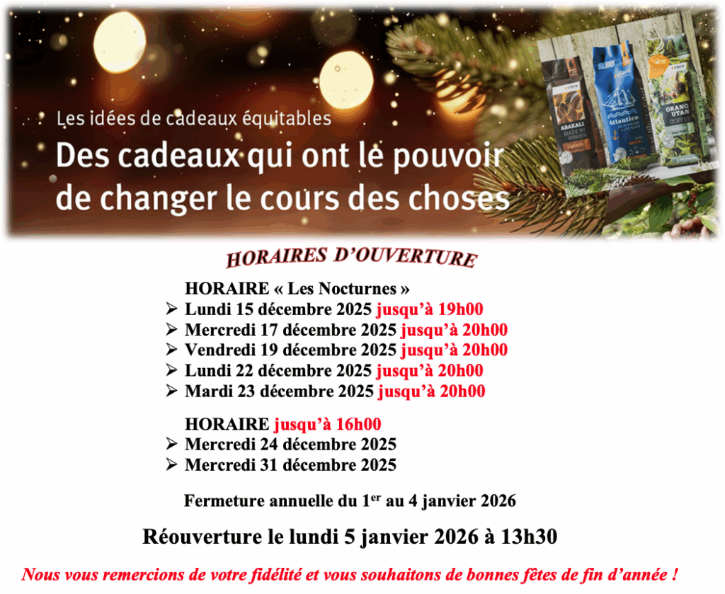 Le magasin fera des nocturnes pour les fêtes de fin d’année et sera fermé du 1er au 4 janvier. Voir horaire ci-dessous.